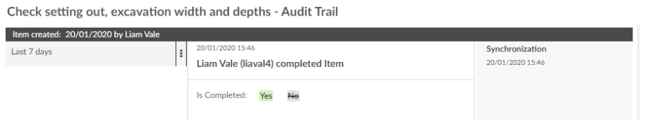 Click an entry in the grid to view the details of the change on the right side of the window. Audit trails opened within the Sites section of the Checklists module have a Synchronisation column, which displays the time at which the action was synchronised. This may be different to the actual time the action was taken (displayed above the action) if the user was offline at the time.