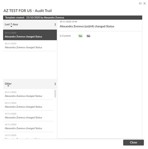 CCC keeps a record of when an item was created, each time it has changed status and who effected those changes. These records are called audit trails. They can be viewed via right-click > Audit Trail or left-click > menu icon