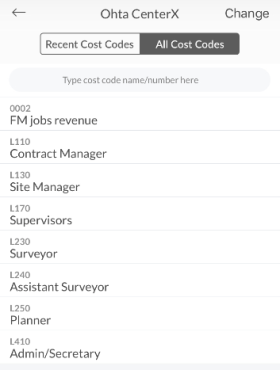 Tap to select the cost code you wish to assign to this clock in transaction. You can find recently used cost codes under the Recent Cost Codes tab, or view all available cost codes for the current job under the All Cost Codes tab. To change to a different job, tap Change to open the Change Job screen, then tap to select the new job.