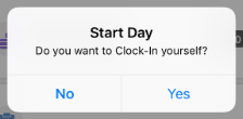 Tap the CLOCK IN button. If you are not already clocked in, you will receive a popup message asking if you want to clock yourself in.