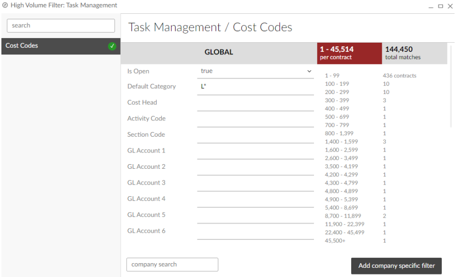 The numbers on the right side of the window show the number of contracts that have a certain range of cost codes available under the current filter criteria. For example, in the image above, 535 contracts have 1-99 cost codes available, 32 contracts have 100-199 cost codes available, and so on.